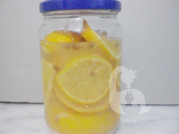 Bir kaç tanesini dibine sıkabiliriz. Bir hafta boyunca arada bir sallayarak limonların suyunu bırakmasını bekliyoruz. Limonlar yumuşayıp, kavanoz neredeyse limon suyu ile doluyor. Hem limonları hem de sularını 1 hafta sonra kullanabilirsiniz. Ben daha büyükçe bir kavanoza yapmıştım hem kullanıldığından hem de limonlar yumuşayıp dibe çökmesinden dolayı küçük bir kavanoza aldım.