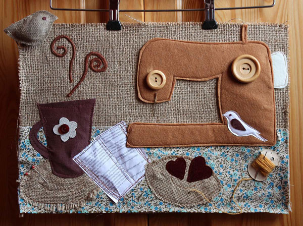 Elbise askısı üzerine takılıvermiş bu dikiş odasına yakışacak hoş pano aplike ve makina nakışı kullanılarak yapılmış. Kadınlar ayrıntıları çok sever panoda da ayrıntıları görmek mümkün, kahvenin dumanı iplik makarası, makinenin iğnesi unutulmamış. Cuval bezine yapılması da ayrı bir güzel olmuş. Yayınlanan site..