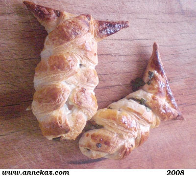 Milföy hamurunu seven var sevmeyen var gözlemlediğim kadarıyla erkekler pek sevmiyor.Yerken çok dökülen ama ağızda da dağılan kolay bir hamur tatlı da tuzlu da yapılıyor.Yani anlayacağınız kolaya kaçmanın yolu:D Evde buzlukta öyylece duruyorlardı çaya gelen kızkardeşime yapalım mı dedim e bari yapalım dedi.Bende değişik olsun diye balık şeklinde yaptım içine peynir ve maydanoz koydum.Az koymuşum hamur pişip kabarınca hamurla içi dengesiz olmuştu.Siz bol bol koyun..Birde tane biberle göz yaptım şart değil ama varsa ekleyebilirsiniz.Nasıl yaptığıma gelince burada bir kaç fotoğraf çekmiştim.Balık böreği Tabağa koyup adam gibi fotoğrafını çekemedim çünkü çaylar doldurulmuş tabaklar önlere çekilmiş vaziyetteydi..:)