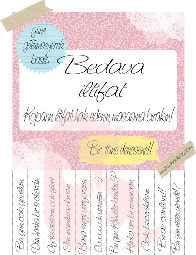 Bu da bir inovasyon sayılır sanıyorum zira bu tür ilanlar genelde eleman aramda vs de kullanılıyordu benim hazırladığım posterde yukarıda zaten amaç belli ediliyor ve güne gülümseyerek başla deniliyor daha sonra Bedava iltifat kopar iltifatı hak edenin masasına bırak edinelere kullanma talimatı da verilmiş oluyor. Aşağıda ise bastırdıktan sonra kesilecek yerler var bu kesilecek dilimlerde Bu gün çok güzelsin, Sen inanılmaz birisin, kanka sen bir numarasın , ayakkabıların çok güzel gibi iltifatlar var. koparıp iltifatı hak edenin masasına gizlice ya da açıktan küçük bir gülümseme ile bırakıyorsunuz nasıl ama :))