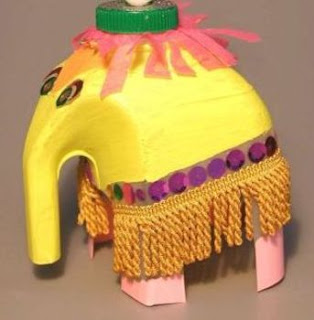 Fillerin uğur getirdiğine inanılır, pek çok evde sıra sra dizilidir. Ben bu tür şelere inanmamam ama yukarıdaki fillerin çok ilginç olduğu bir gerçek. Süt bidonlarından yapılan bu şirin filler pullarla boncuklarla süslenip fil şekline göre boyanmış.