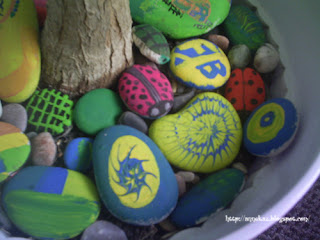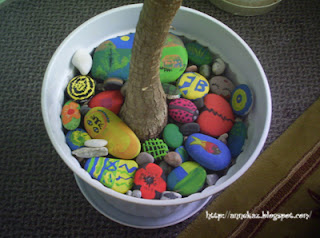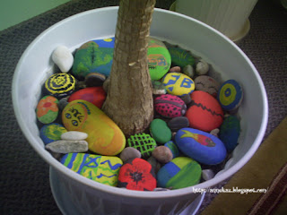 Evde bulunan palmiyegiller ailesinden olduğunu düşündüğüm dev ağaçlara benden ve çocuklardan hediye..Tatilde aa bu taş çok güzelmiş vay şu taşın rengine bak diye diye topladığım bir bagaj taşında böylece bir kısmını değerlendirmiş oldum.Evde bulunan boya renklendirici (sarı yeşil) ve çocukların guaj boyaları ile yaptık,bazıları çift taraflı oldu bir tarafı kalp bir tarafı çiçek gibi.. verniklenirse eminim çok daha güzel görünür.küçük çakıl taşları ile renk kombinasyonları çok güzel oluyor.