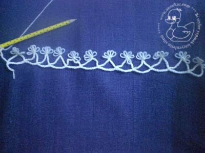 Eni için iştedğiniz uzunlukta zincir çekip dönüyorsunuz Çiçekleri için kalme yada şişe ilk ilmeği geçiriyorsunuz.Daha sonra 1 zincir altından ilmek çıkarıp sık iğne ile sabitliyorsunuz.o ilmeği tığ üstüne dolamadan şişe takıyorsunuz. bu şekilde 5 çiçek yaprağı yapıp 10 zincir çekiyorsunuz ve en başladığınız zincire sık iğne yapıp tutturuyorsunuz.Yine 10 zincir yapıp aynı çiçeği yapıyorsunuz.bu şekilde ilk sıra tamamlanıyor daha sonrtaki sılararda zincir yerine çiçeğin ortasındaki yaprağa tutturuyorsunuz.Kenar dönmelerinde 15 zincir falan çekmek gerkiyor.