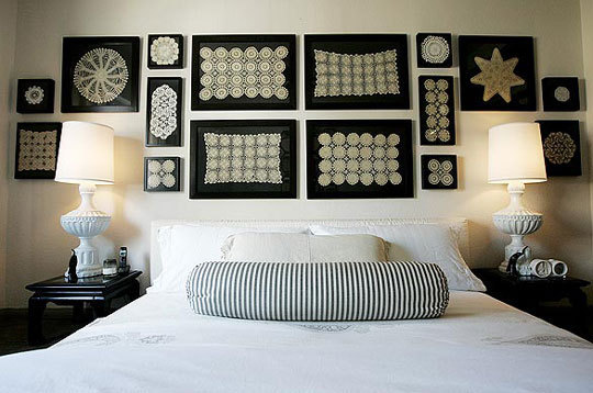 Eski danteller tek kalmış oda takımları yıpranmış ince iş iğne oyaları ya da motifleri atılmaya orda burada tıkılı kalmaya gönüller razı olmamışki böyle yatak odası dekoruna ren katacak şekilde çerçevelenip duvara asılmış. Arkasındaki siyah fonları ve koyu çerçeveler ile de çok şık bir görüntü olmuş. Eski dantellerini değerlendirmek isteyenler için değişik bir seçenek