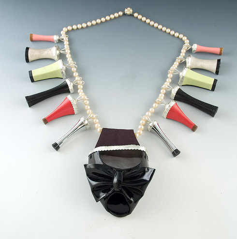 Kadın ayakkabısından yapılan bu kolye modacıların hotcouture çalışmalarını anımsatıyor. İnci kolyeye topuklar ve rugan bir ayakkabının burun kısmı eklenmiş. Kadınların ayakabı tutkusu bilinir de boyuna topuk asacak kadar da değildir her halde Ayyakabı ayakta güzeldir zaten :P Kaynak via