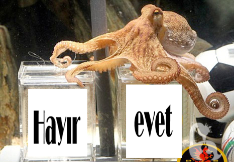 Medyum Ahtapot kupa finallerinde dünyanın gündemindeydi, tahminleri yüzde yüz tutu. Hesaplamalara göre Ahtapot Paul’un tahminlerine göre iddaa oynansaydı 10 liralık bahis 800 lira olarak dönecekmiş falan neyse, şu sıralar referandumla yatıp referandumla kalkıyoruz sanki çok büyük değişiklikler olacak gibi bende Ahtapot Paul’a sordum :P kim kazanacak diye evet etiketli yemek kutusunu seçti.Sizce tahmininde haklı mı:? :)