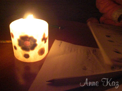 Malesef oturduğumuz semte arada bir elektrikler kesiliyor.Çok uzun sürmesede el altında tedbirlerimizi bulunduruyoruz.Bu mumu uzun zaman önce yapmıştım..Görünüşünü çok beğenmemiştim ama dün yakmak zorunda kalınca güzelliği ortaya çıktı ..Bu güzellik ve romantik ortam eşliğinde ingilizce dersi gölge oyunları neşesinde geçti ne yapalım elektrik kesintisinden bile eğlence çıkaran bir aileyiz..Muma dekopaj yapımı ile ilgili konu için tıklatın
