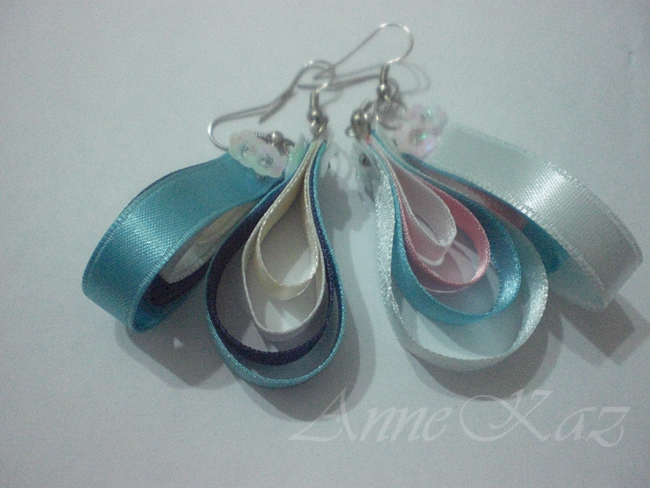 Bu küpelerin tasarımını Flickr'de görmüştüm kızım çok beğenmişti elimde malzeme olunca bi kaç tane yaptım. Çok kolay bir küpe, değişik renkte aynı kalınlıkta kısadan uzuna kurdeleler bir birine dikilerelk yapılıyor. Orjinalinde kapama klipsi vardı ben çiçekli pullar kullandım..Yapım aşamalarını fotoğraflamaya çalıştım…