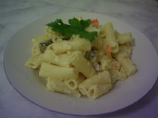 1 paket haşlanmış makarna ,4-5 adet haşlanmış doğranmış doğranmış patates,8-9 adet ince ince doğranmış kornişon turşu ,iki kaşık haşlanmış bezelye,haşlanmış minik minik doğranmış havuç hepsi karıştırılır 1 bardağa yakın mayonez iki kaşık yoğurt iki kaşık ayçiçek yağı , tuz karabiber,pul biber ayrı bir yerde iyice karıştırılıp makarna karşımına dökülüp iyice harmanlanır salatamız hazır..kendisi çok opsiyoneldir ben bizimkini anlattım içine bir şeyler ekleyip çıkartabilirsiniz..size kalmış