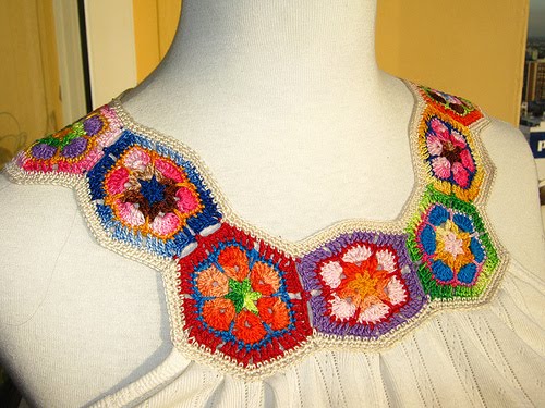 Ne kadar hoş bir tığ işi motif, tişörtte de yaka olarak çok şık olmuş. Tığ işi motifler temel olarak aynı mantığa dayanıyor bu şekilde birleştirerek elbise fular atkı vs ile kombine ediliyor yada kocaman yatak örtüsü olarak kullanılabiliyor. Güzel bir model canlı renklerle daha bir neşe dolu olmuş..