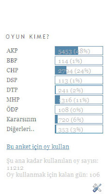 El sanatları blogunda siyasi bir anket için 11212 çok güzel bi rakam. Kaldıralı bir kaç gün oldu fakat bir türlü vakit olmadı eklemeye yine araya sıkıştırıyorum.Aslında yazacak söyleyecek çok şey var.