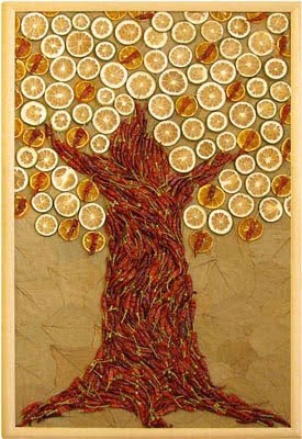 Aklınıza gelir miydi böyle bir tablo yapmak dün kahve çekirdekleri çalışmalarını yayınladığım Alina Nazirova’nın çalışmalarından birisi daha..Kuru biber ve portakal kullanmış. Muhteşem bir sonbahar ağacı olmuş ..Değişik turunçgiller kurutularak farklı tonlar elde edilebiliyor denemek isteyen olur mu bilmiyorum ama gerçekten ilgi çekici bir eser..