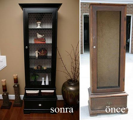 Üçüncü çalışma ise çok tanıdık bir telli dolap dönüşümü, yine koyu renklerle salona yakışır bir büfeye dönüşmüş. Cam yerine tel kullanılması da nostaljik bir hava katmış.